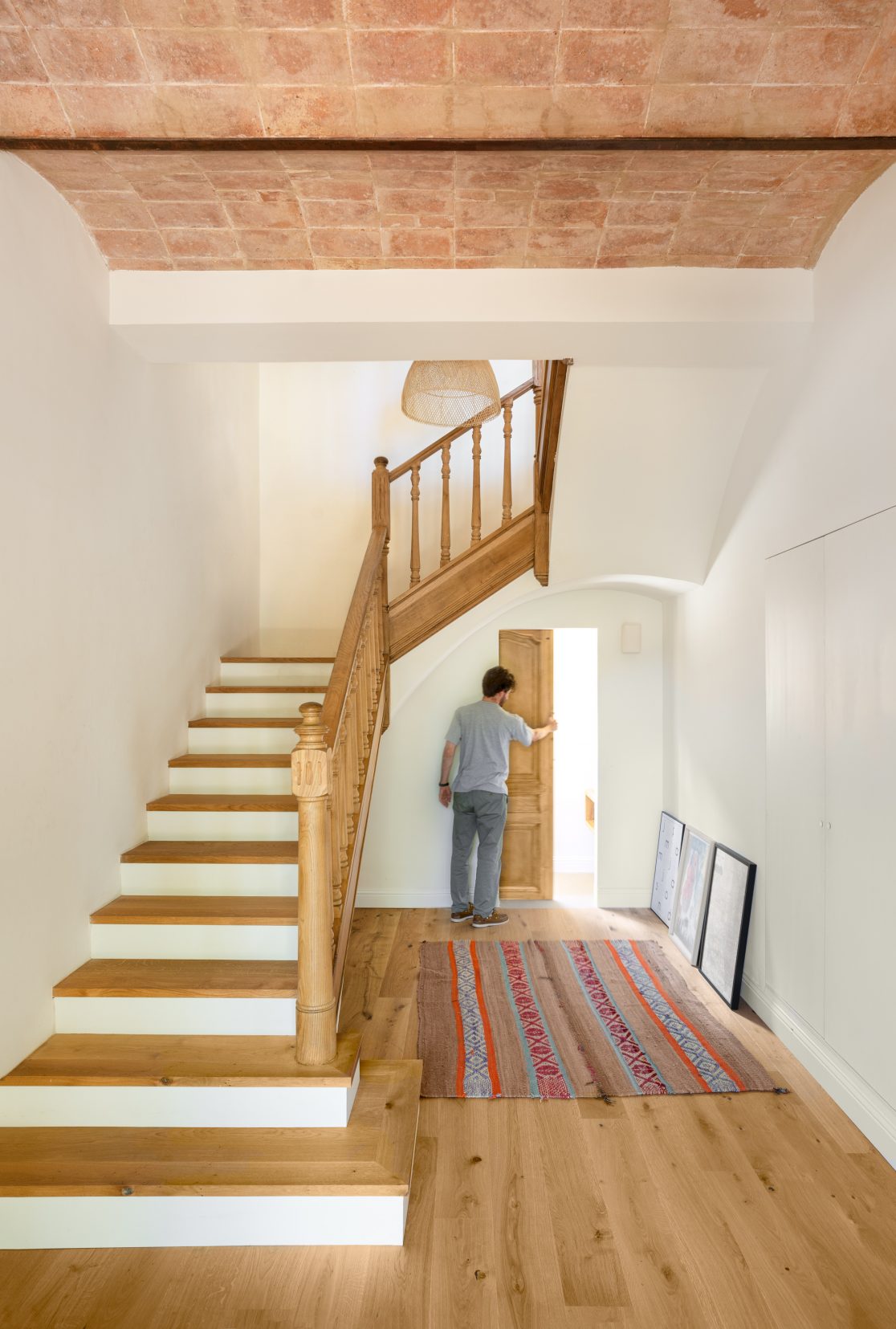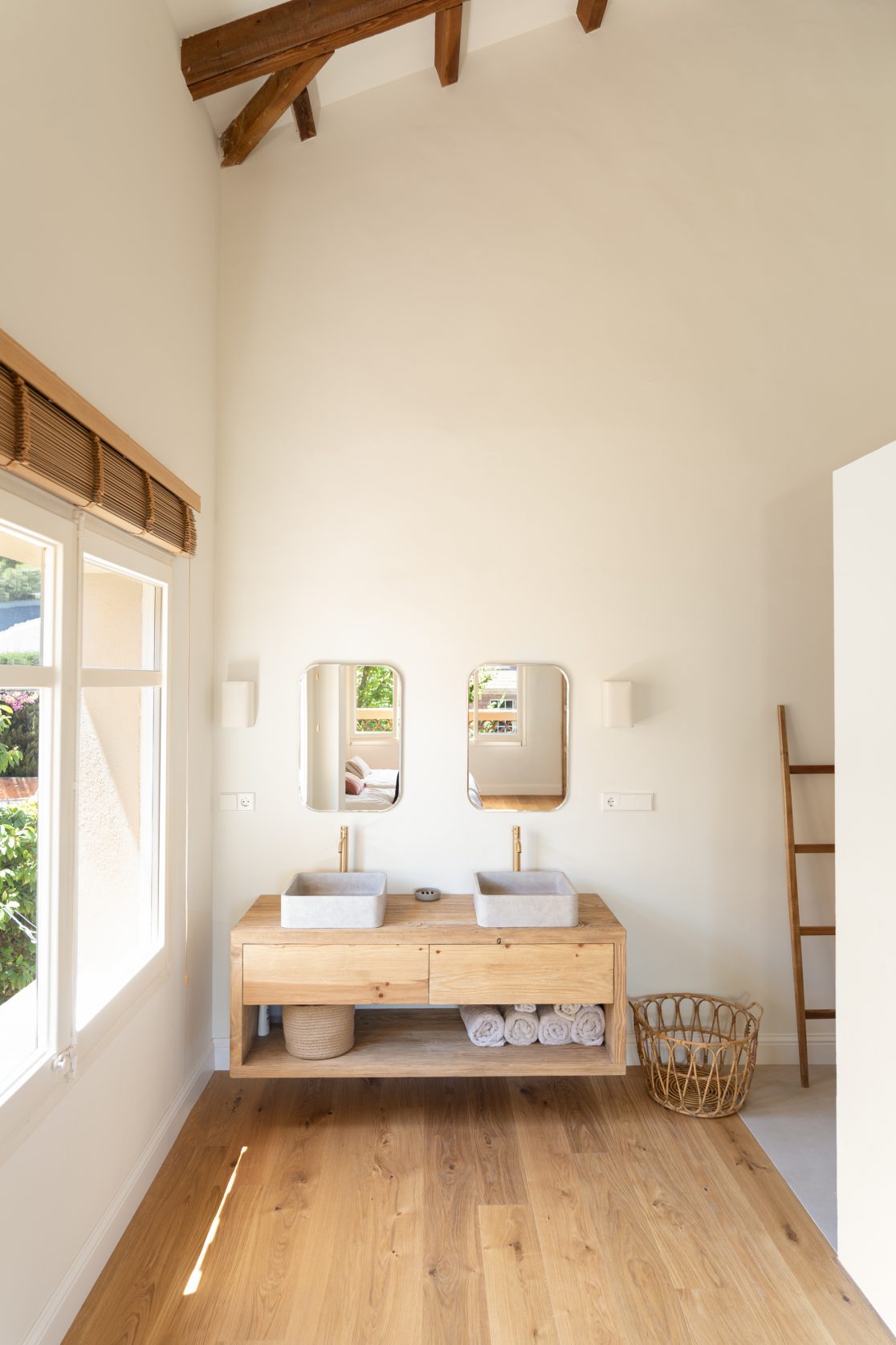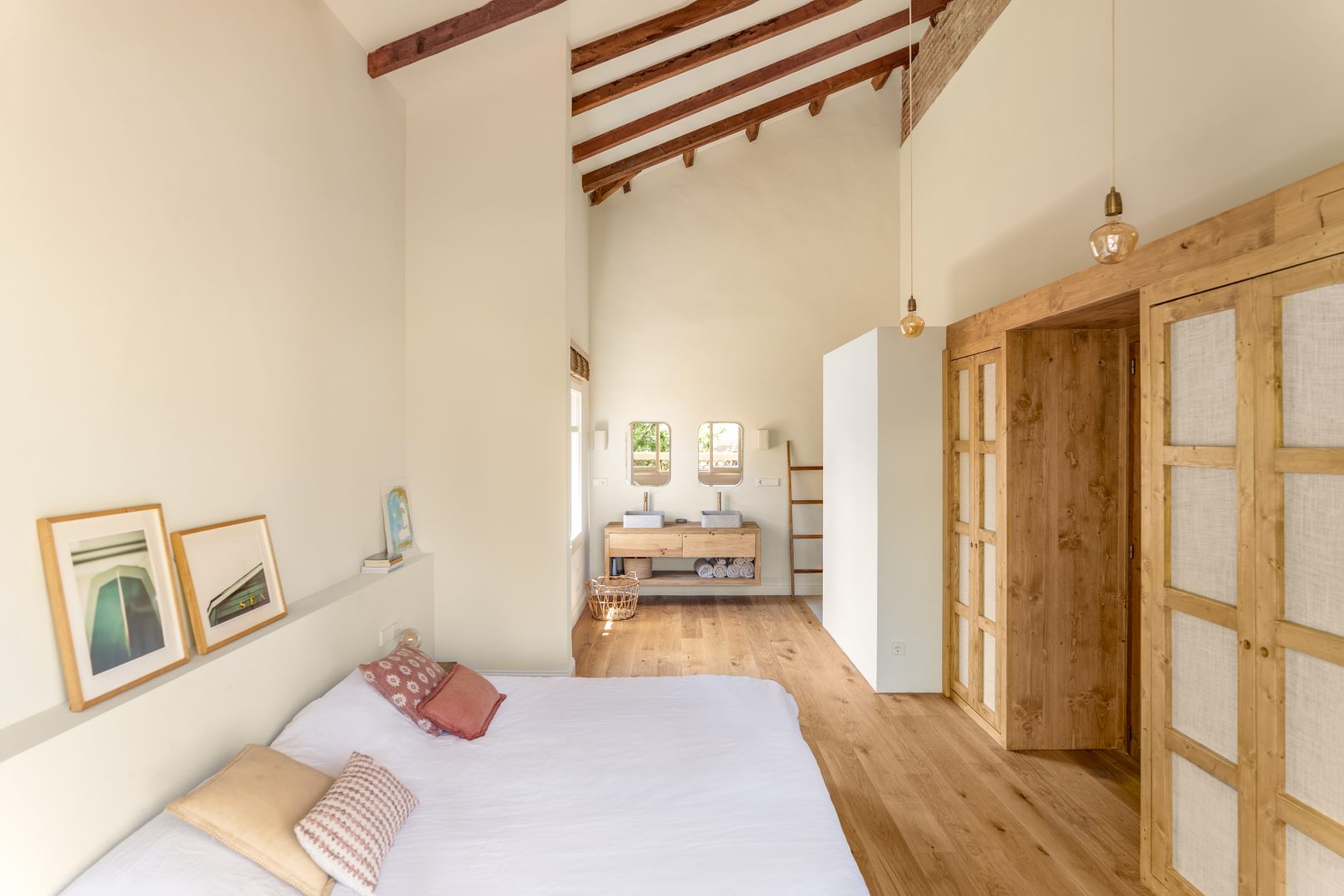 La madera, como material principal, se ha trabajado cuidadosamente de forma artesanal en la carpintería de toda la casa. Además, se han rescatado elementos originales de la finca, como las vigas y la bóveda catalana, que añaden un toque único y respetan la historia del lugar.