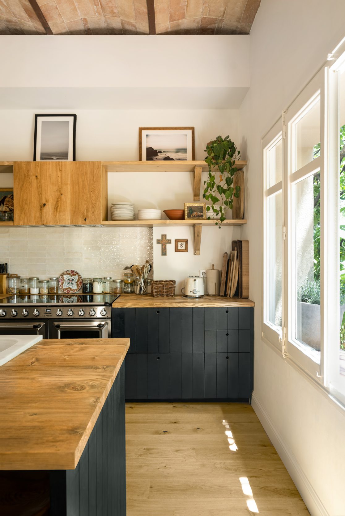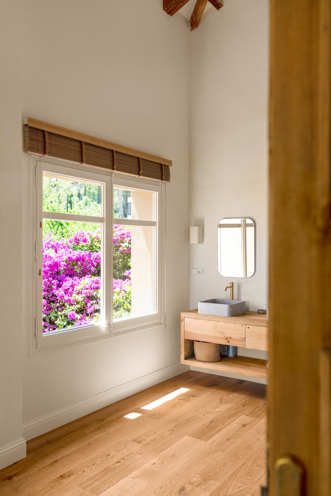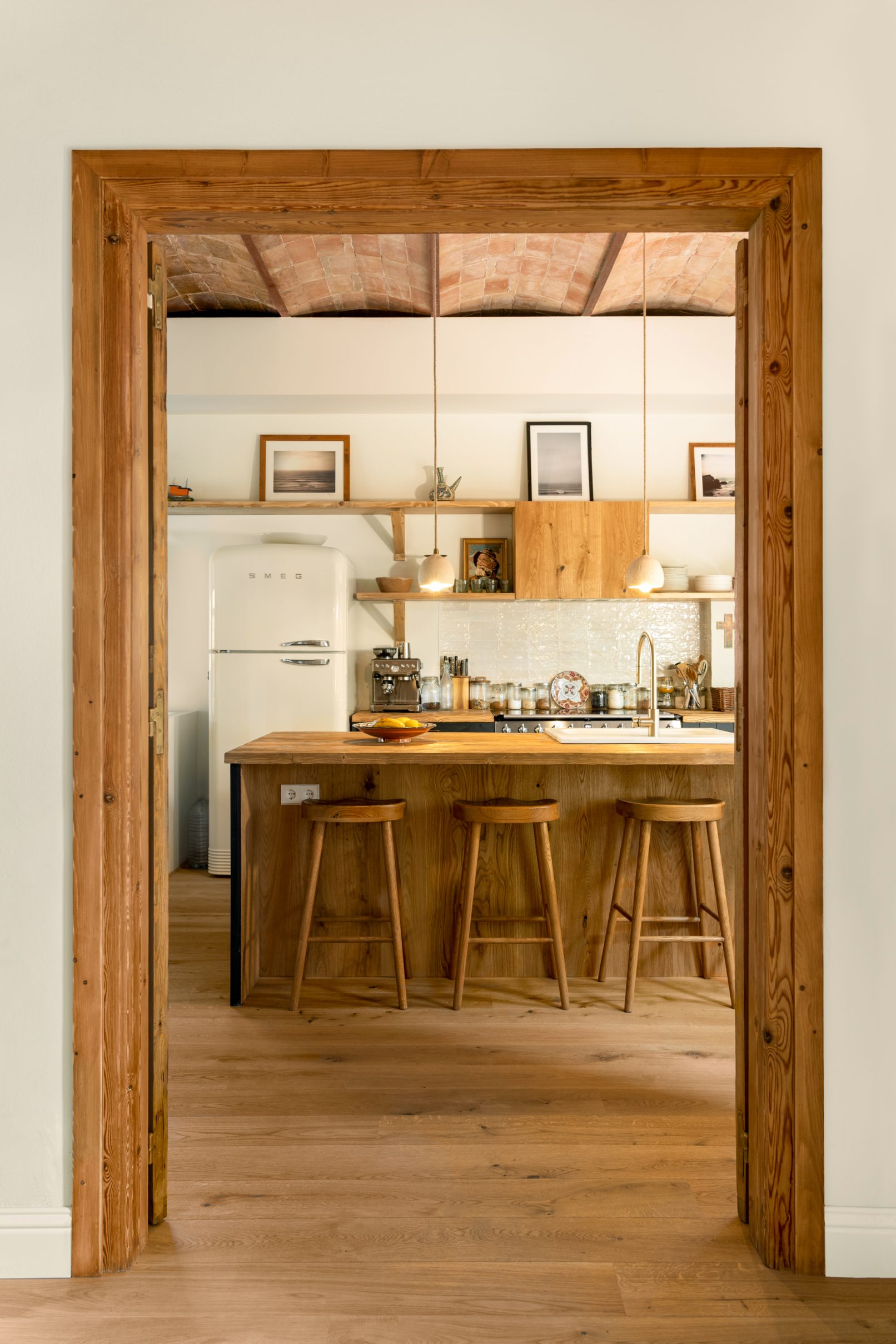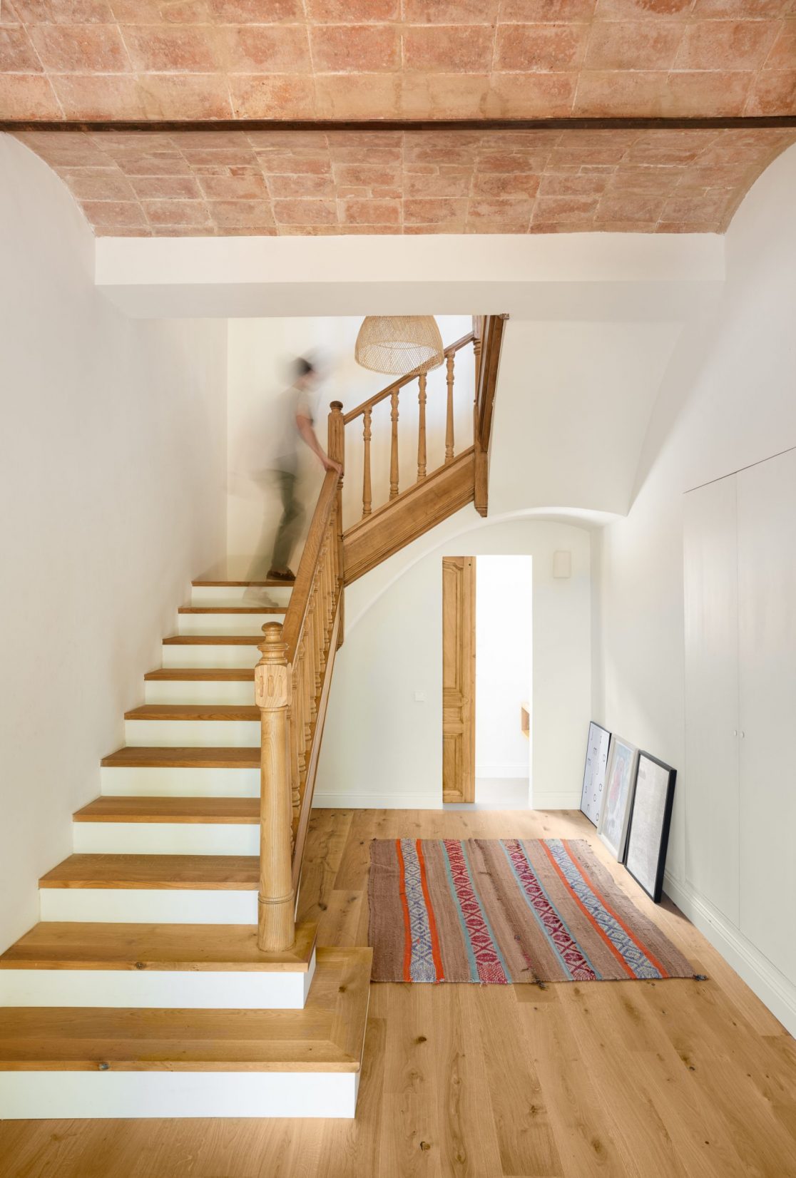 La madera, como material principal, se ha trabajado cuidadosamente de forma artesanal en la carpintería de toda la casa. Además, se han rescatado elementos originales de la finca, como las vigas y la bóveda catalana, que añaden un toque único y respetan la historia del lugar.