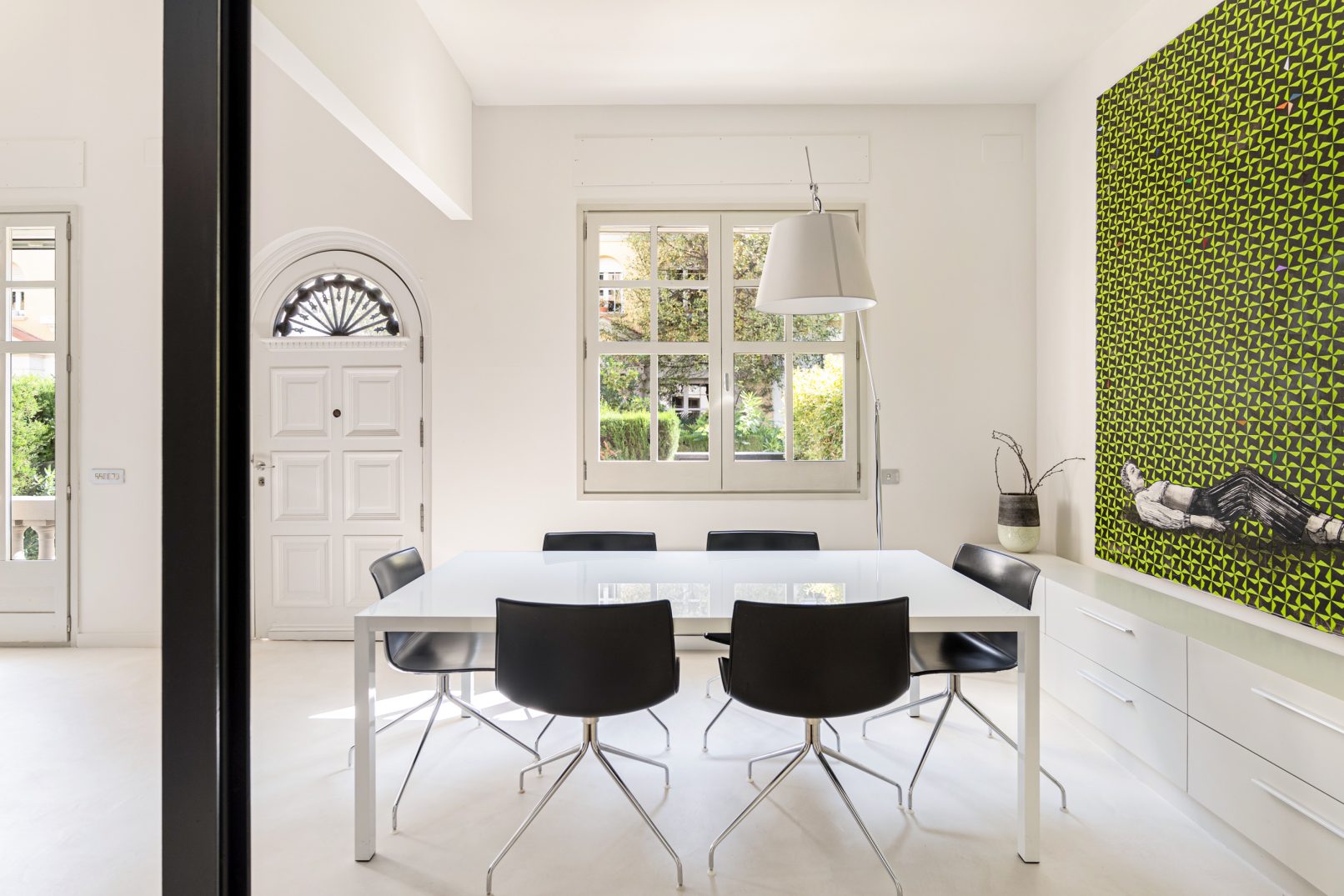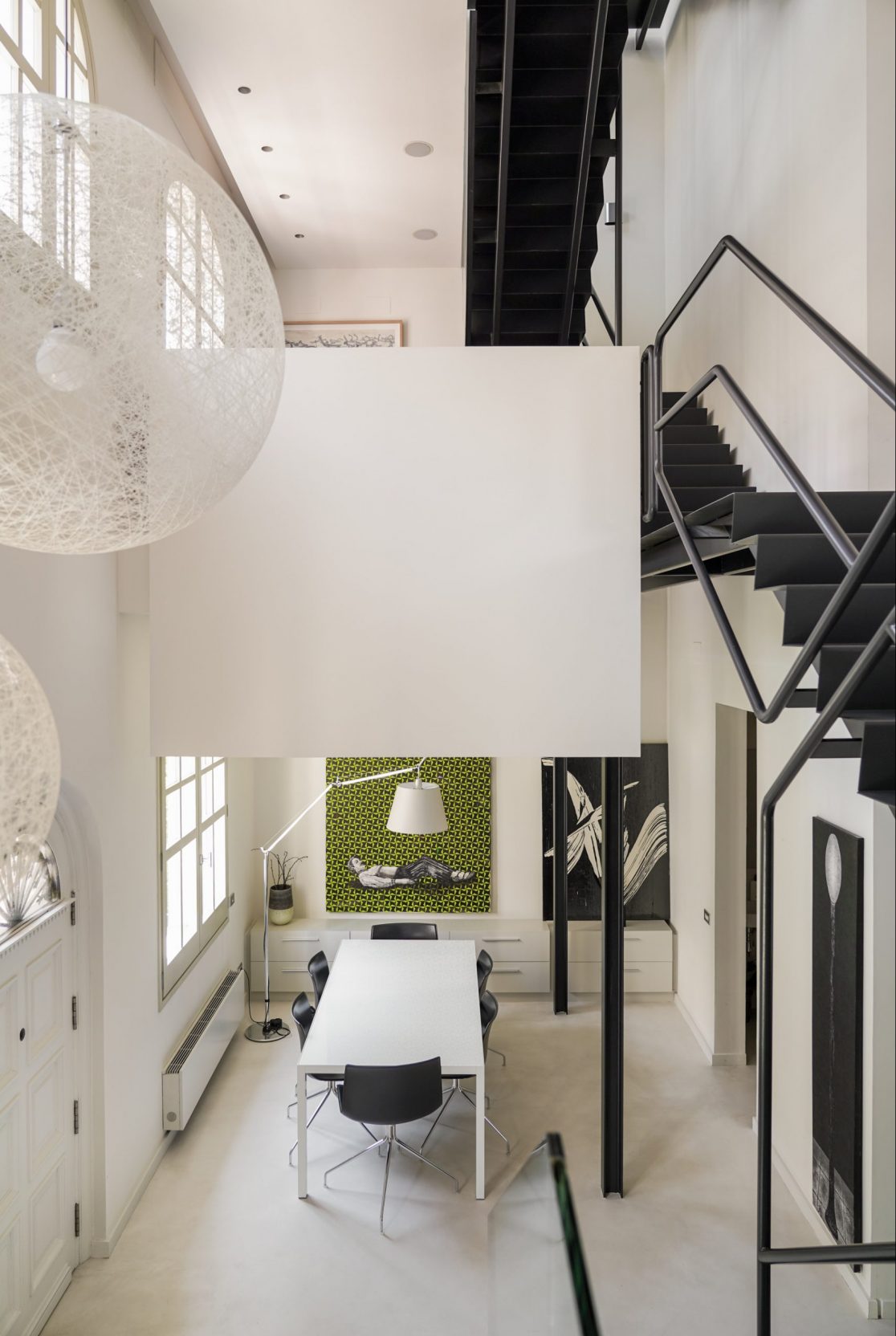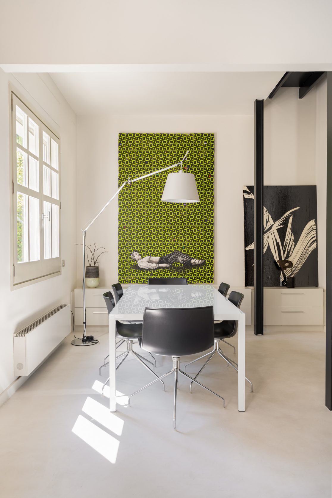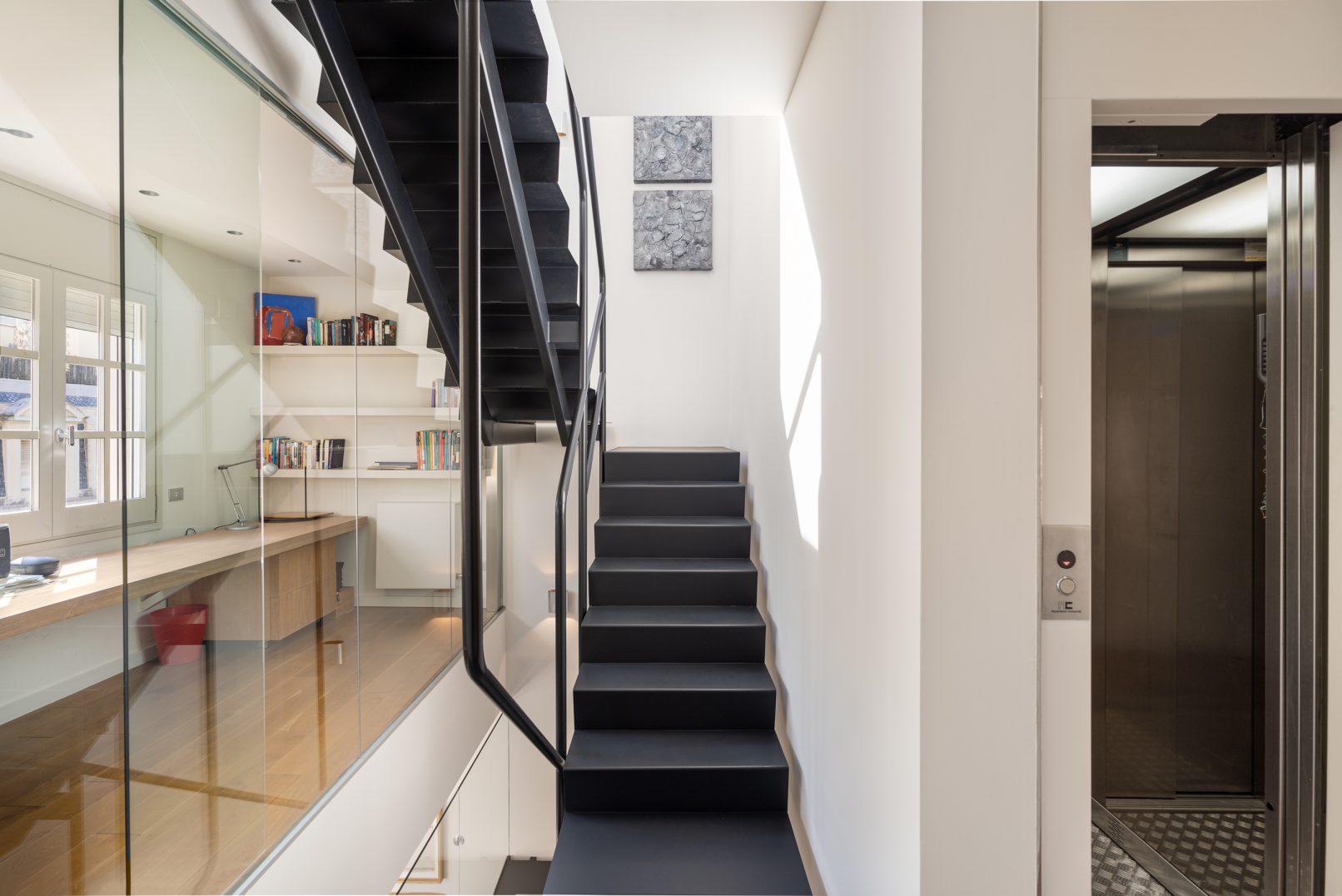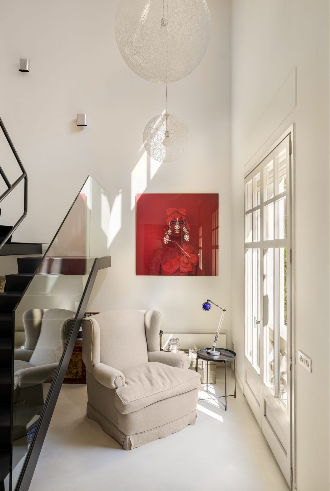 Reportaje de una espectacular casa de diseño en Barcelona, para la agencia Somos. Destaca por los contrastes entre blanco y negro, con paredes y suelos claros contrapuestos a la negra escalera, el eje central de la propuesta arquitectónica. La luz que entra por los grandes ventanales, los materiales elegidos y los toques de color de las obras de arte, le dan calidez a este espacio de transición entre estancias. Fotos de interiorismo, arquitectura y detalles lifestyle.