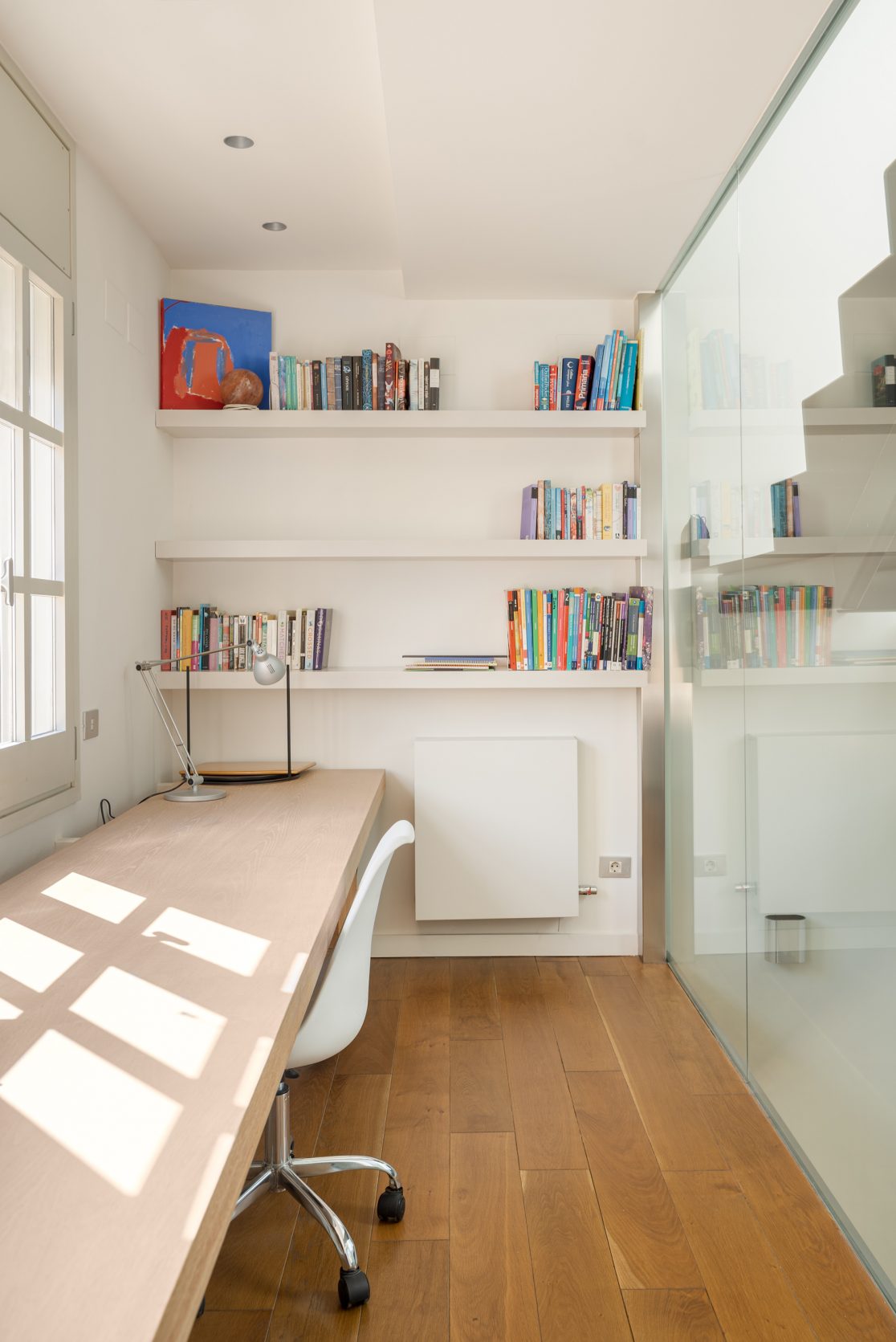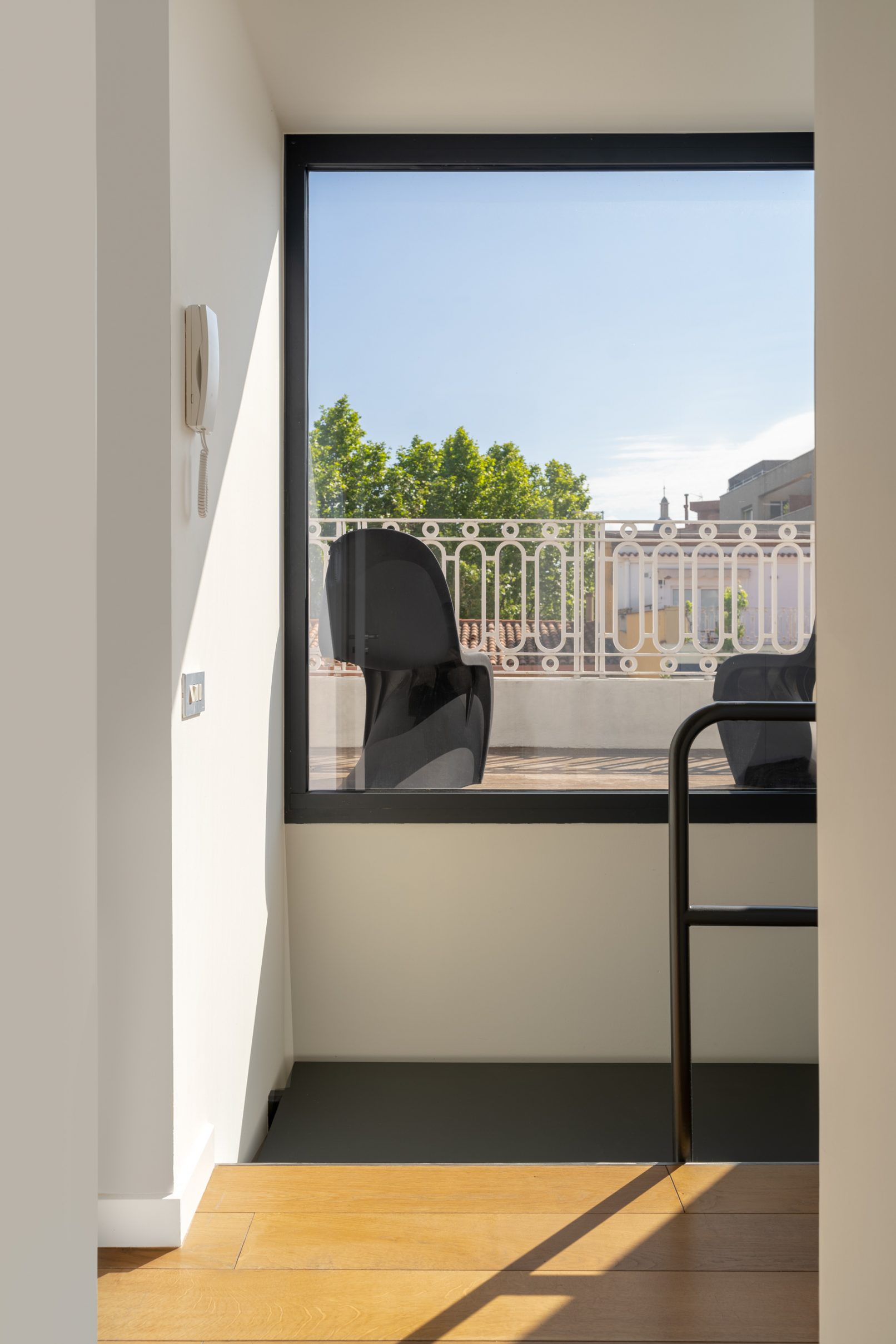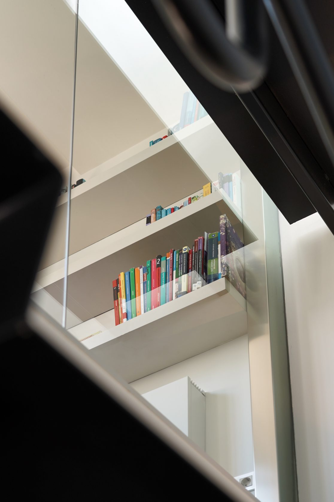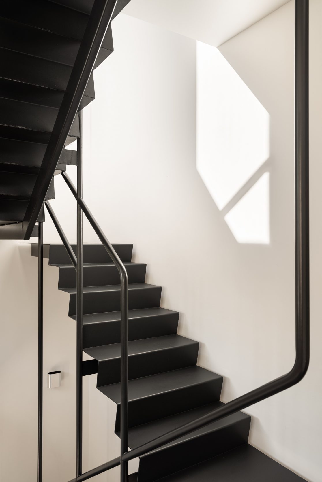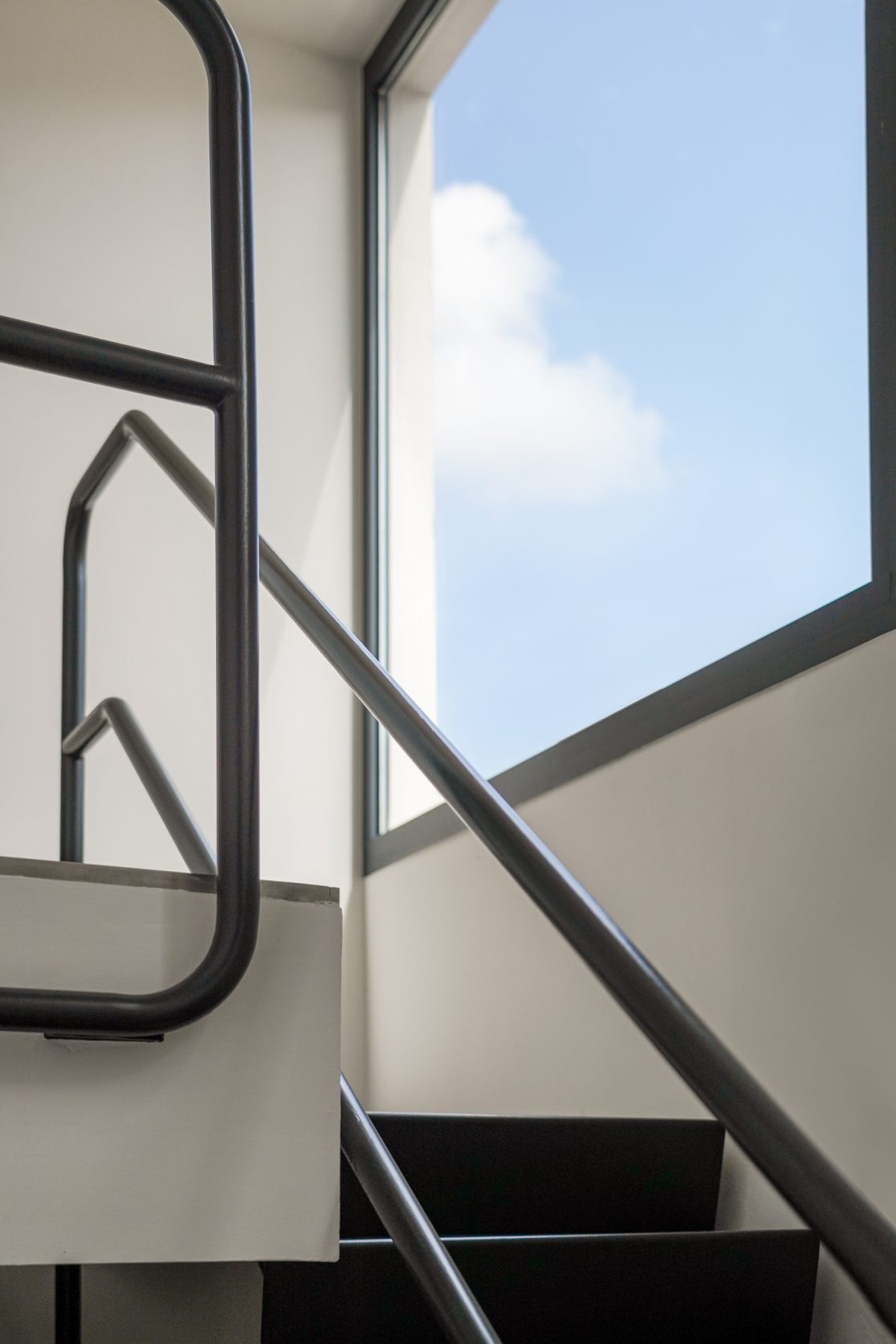 Reportaje de una espectacular casa de diseño en Barcelona, para la agencia Somos. Destaca por los contrastes entre blanco y negro, con paredes y suelos claros contrapuestos a la negra escalera, el eje central de la propuesta arquitectónica. La luz que entra por los grandes ventanales, los materiales elegidos y los toques de color de las obras de arte, le dan calidez a este espacio de transición entre estancias. Fotos de interiorismo, arquitectura y detalles lifestyle.