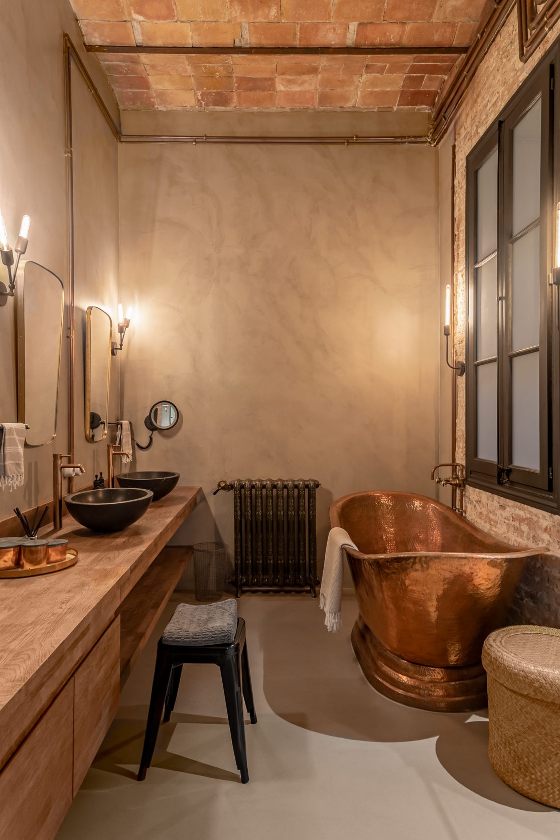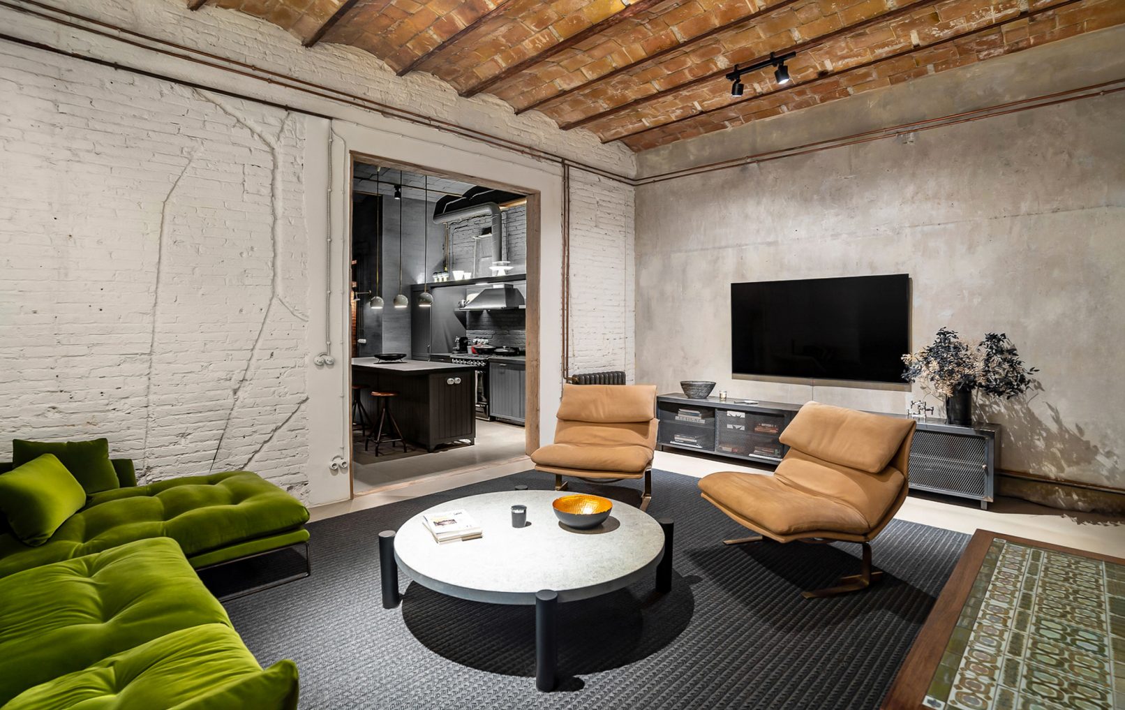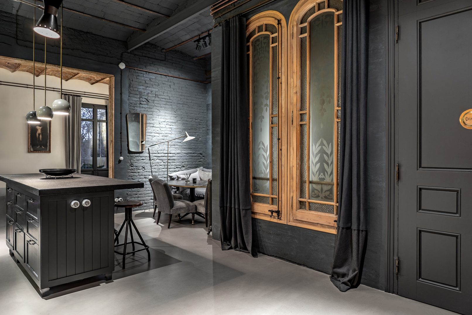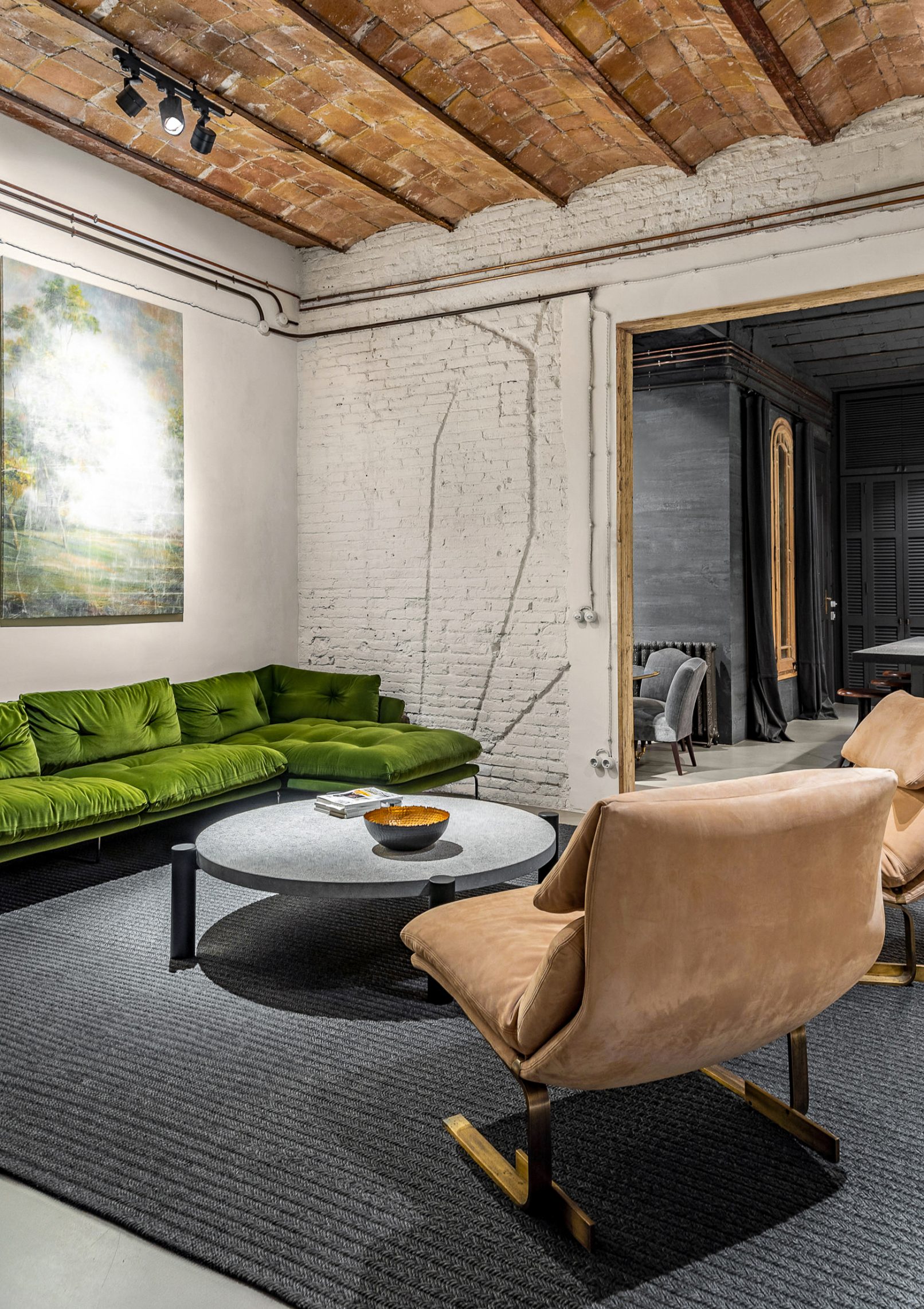 Este proyecto combina carácter industrial y elegancia contemporánea, conservando elementos históricos como la bóveda catalana, el ladrillo visto y canaletas de cobre.