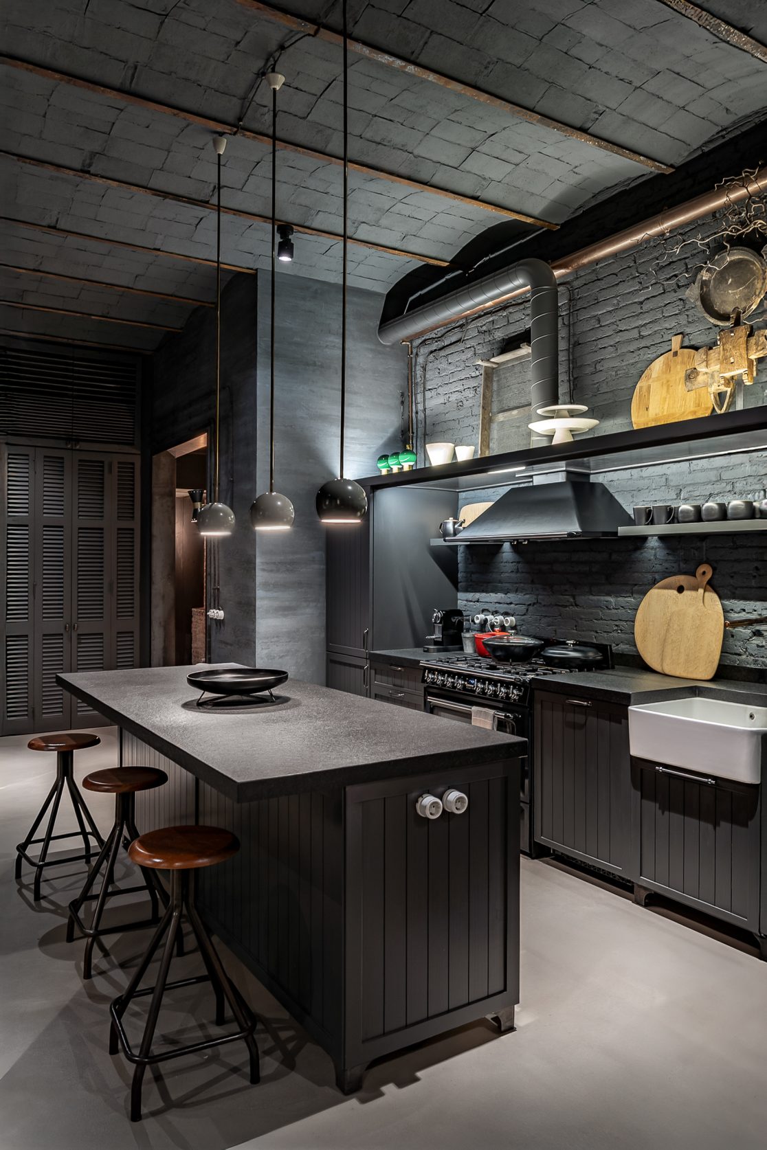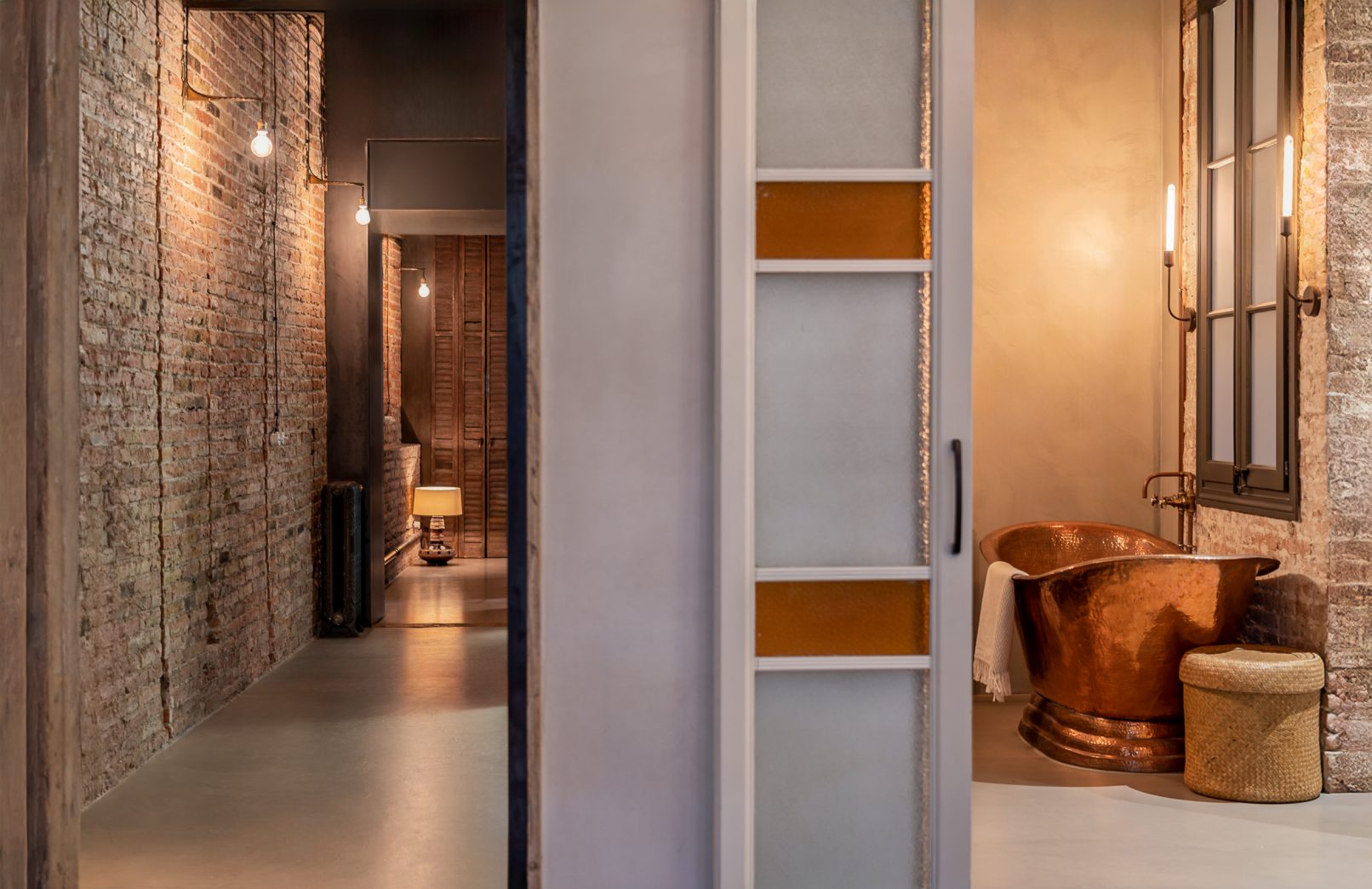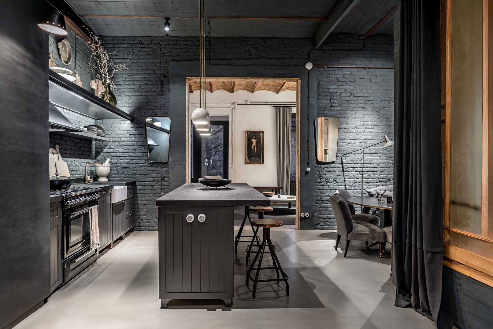 Este proyecto combina carácter industrial y elegancia contemporánea, conservando elementos históricos como la bóveda catalana, el ladrillo visto y canaletas de cobre.